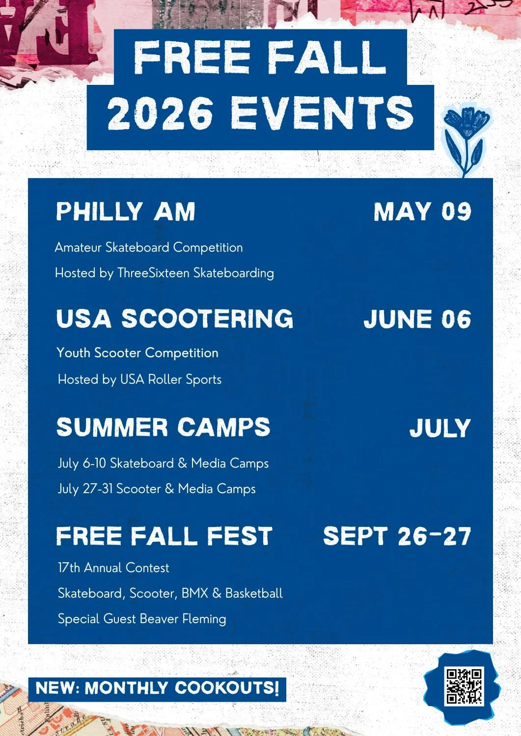 We are pumped to partner Philly AM and USA Scootering to kick off the Action Sports season with a bang. Summer Camp registration is not live yet but will be as soon as we hear confirmation on the grant. The 17th Annual Free Fall Event is turing into a Fest! The growth each year is so fun to see. Plan now to attend!